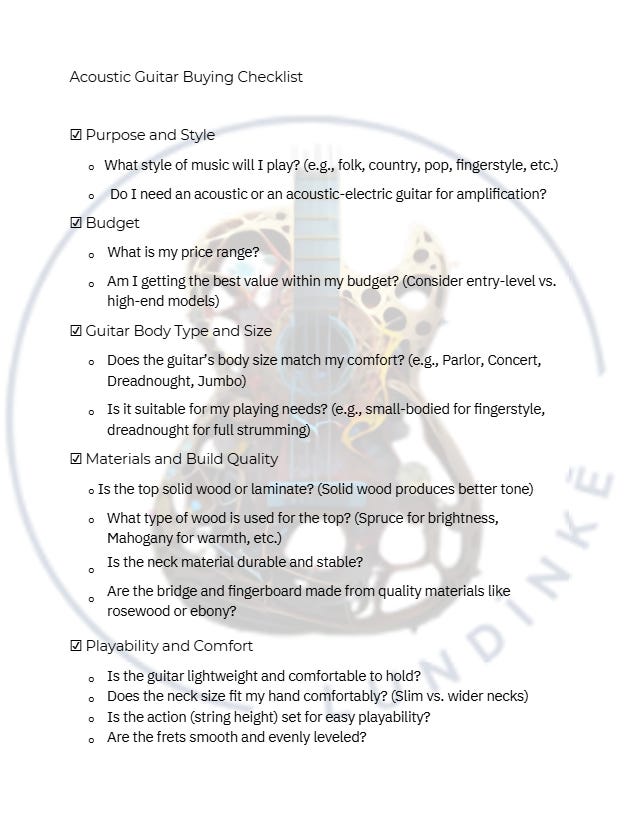 Acoustic Guitar Buying ChecklistDec 11, 2024∙ PaidShareLundinke Acousticchecklist3.3MB ∙ PDF fileDownloadDownloadThis post is for subscribers in the Pro Plan planUpgrade to Pro PlanAlready in the Pro Plan plan? Sign inPreviousNext