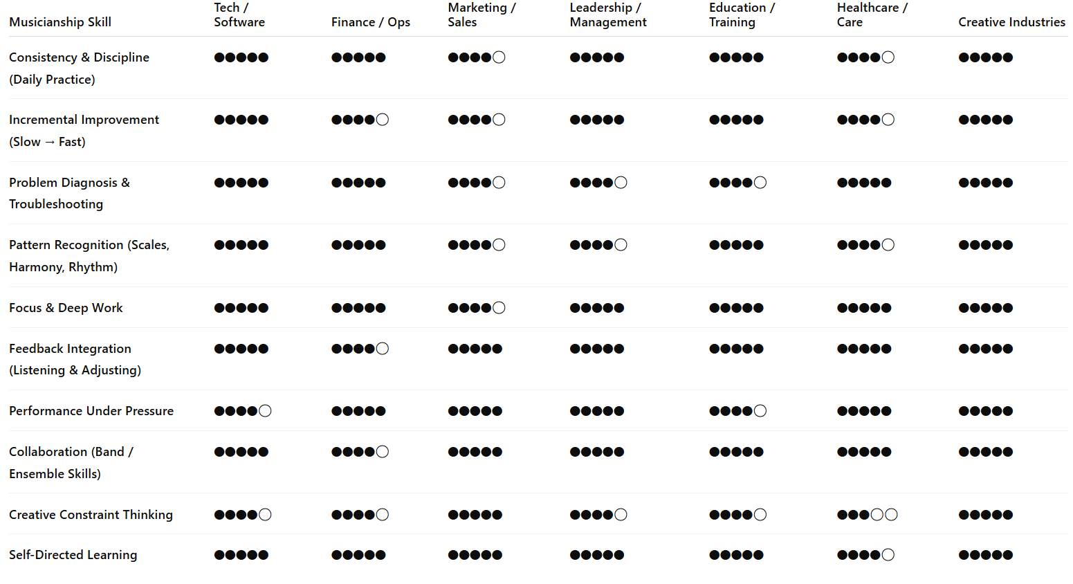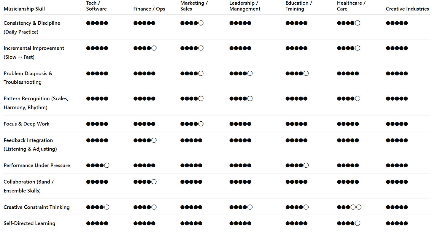 After reviewing research on skill transfer, employer surveys, cognitive studies, and real career trajectories of musicians working outside the music industry, I noticed something that challenged a deeply ingrained belief: